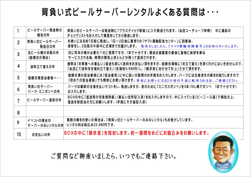 小牧市・名古屋市・愛知県内のビールサーバーレンタルに合わせ「ショルダーサーバーのレンタル」の問い合わせが増えています。当店では純正の部品を使いお客様にレンタル頂いております。現在6台の「背負い式ビールサーバー」が御座いますが、・・・ドームで使っているものと基本的には変わりません。当店へ引き取りにお見えになる方は生樽を冷やし「容器に入れ氷詰め」にしてお渡ししますので、使う直前まで冷蔵庫に入れたり冷やしたりする必要はありません。また地方発送も承ります。